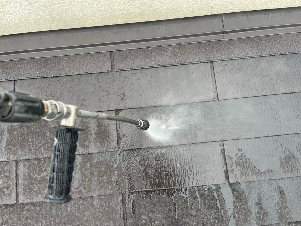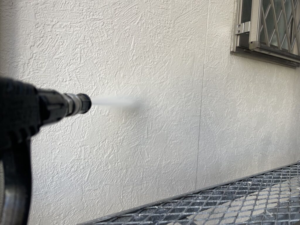 外壁表面に付着した汚れ、コケ、チョーキング(粉化現象)を高圧洗浄機で徹底的に洗い流します。
