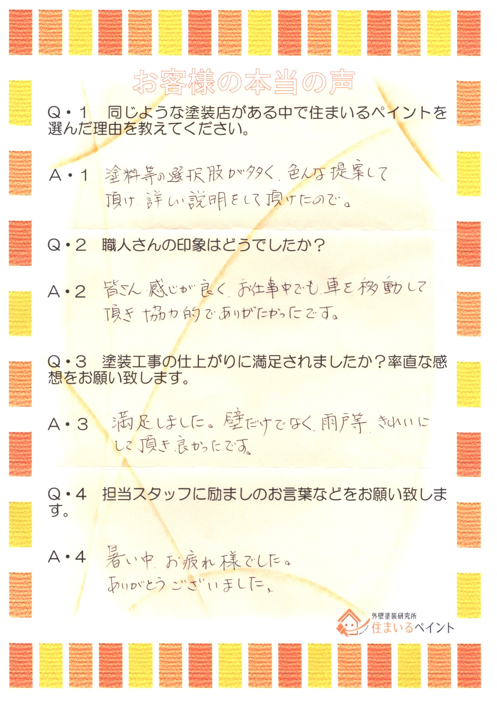 塗料等の選択肢が多く、色んな提案して頂け、詳しい説明をして頂けたので。