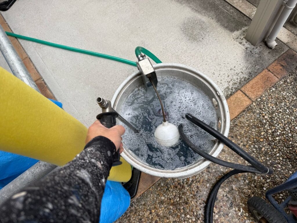 高圧洗浄で、外壁や屋根に付着した汚れを洗い流します。