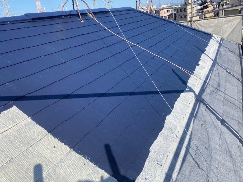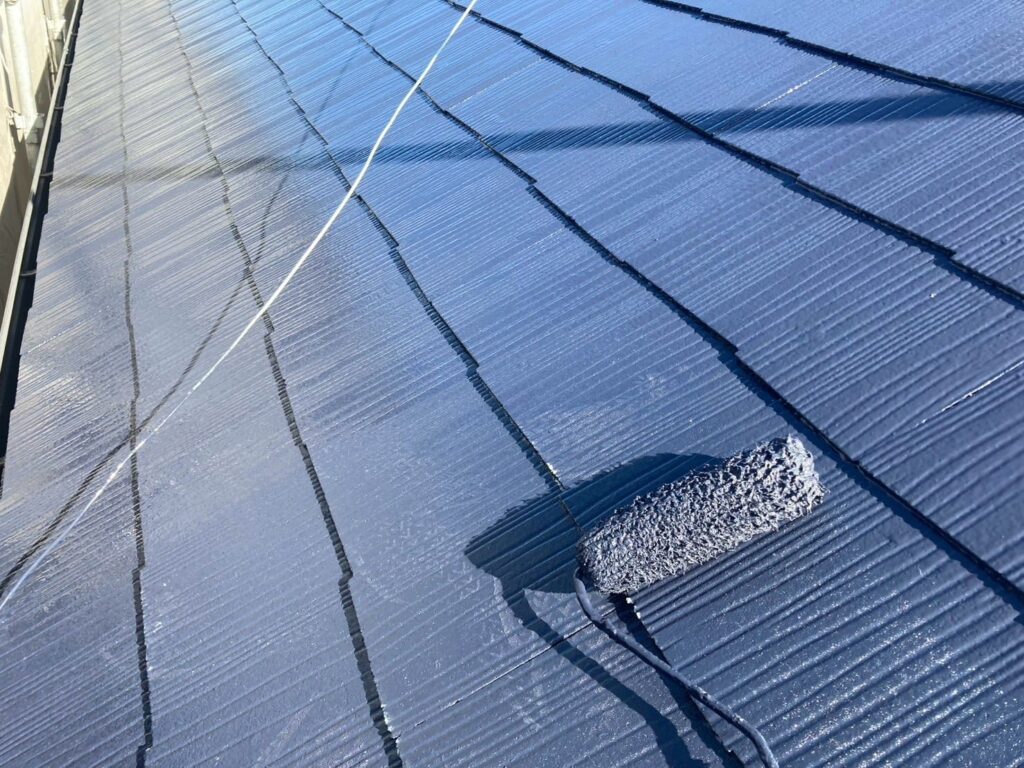 屋根材と屋根材の隙間が塗料で埋まってしまうと毛管現象が起こり、雨漏りの原因になる可能性があります。そのため、屋根の隙間にタスペーサー入れてから、中塗り・上塗りと進めていきます。