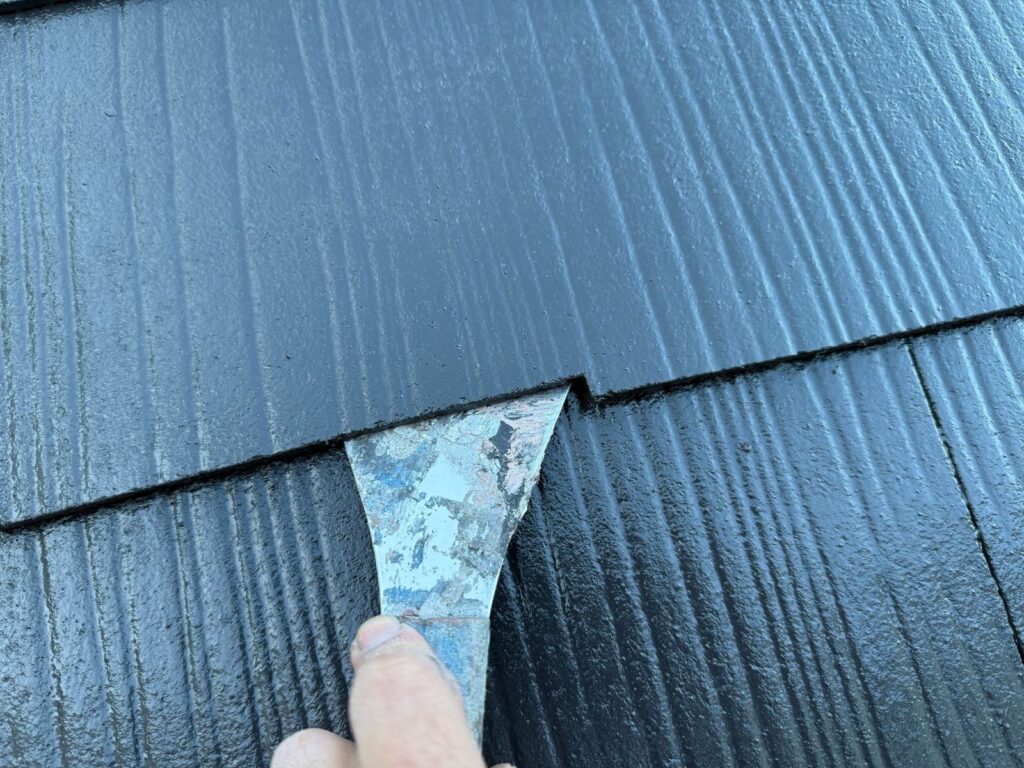 屋根材と屋根材の隙間が塗料で埋まってしまうと毛管現象が起こり、雨漏りの原因になる可能性があります。そのため、屋根の隙間にタスペーサー入れてから、中塗り・上塗りと進めていきます。